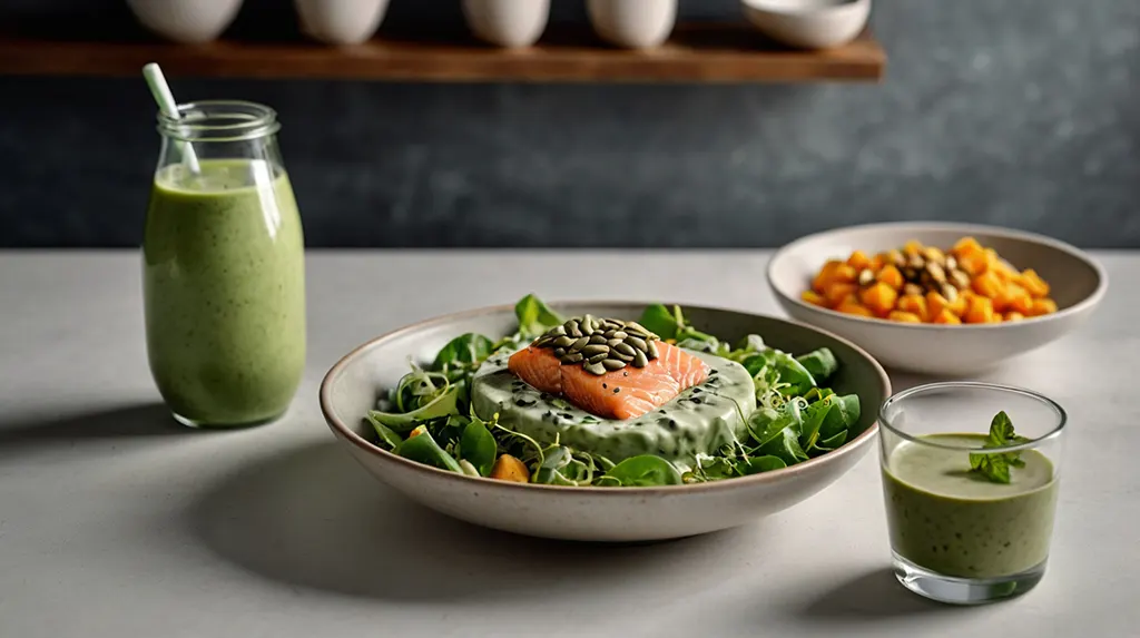 - วัตถุดิบ: ผักคะน้าหั่น, บรอกโคลีลวก, ปลาแซลมอนย่างหรืออบ, น้ำมันมะกอก, น้ำส้มสายชูบัลซามิกหรือน้ำส้มสายชูแอปเปิ้ล, เกลือ, พริกไทย